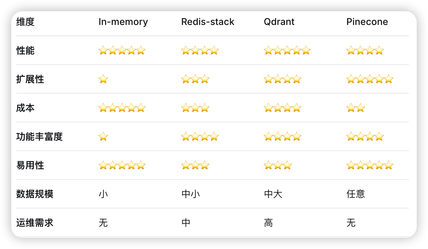 列表 In-memory Redis-stack Qdrant Pinecone 对比总结 选择建议 快速验证/POC:In-memory 已有Redis基础设施:Redis-stack 自托管,注重性价比:Qdrant 无运维团队,追求快速上线:Pinecone 数据敏感,需私有化部署:Qdrant 混合数据类型需求:Redis-stack